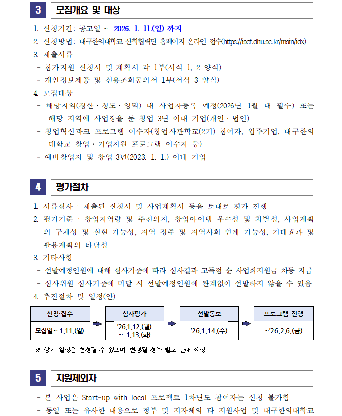 이전으로 2025(2차)년도 글로컬대학30 Start-up with local 프로젝트 모집 공고 지원분야사업화 창업단계 창업(1~3년) 기관명대구한의대학교 한방바이오창업보육센터 접수기간2026.01.06 ~ 2026.01.11 조회수8 붙임_2025(2차)년도 Start-up with Local 프로젝트 참여자 모집 공고문 및 신청서_2026.01.hwp 문의처 E-MAIL : TEL :